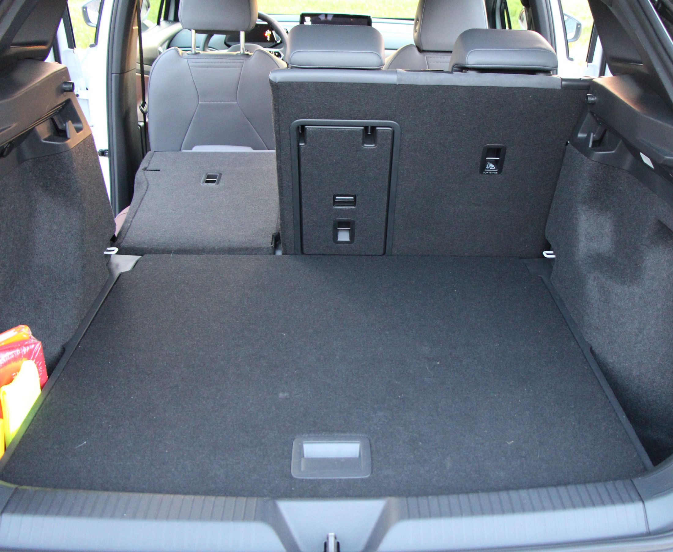 Zavazadlový prostor je hodně velký (základní objem 543 l), pravidelného tvaru a umožňuje jak průvlek na dlouhé předměty, tak sklápění 1/3 a 2/3 (celkem až 1575 l). Jsou zde i dva masivní háčky na tašky s nákupem, ale např. v Enyaqu jsou háčky rovnou čtyři. Potěší hluboká „vana“ pod podlážkou, která se výborně hodí na uschování nabíjecích kabelů, když už ID.4 nemá přední kufr.